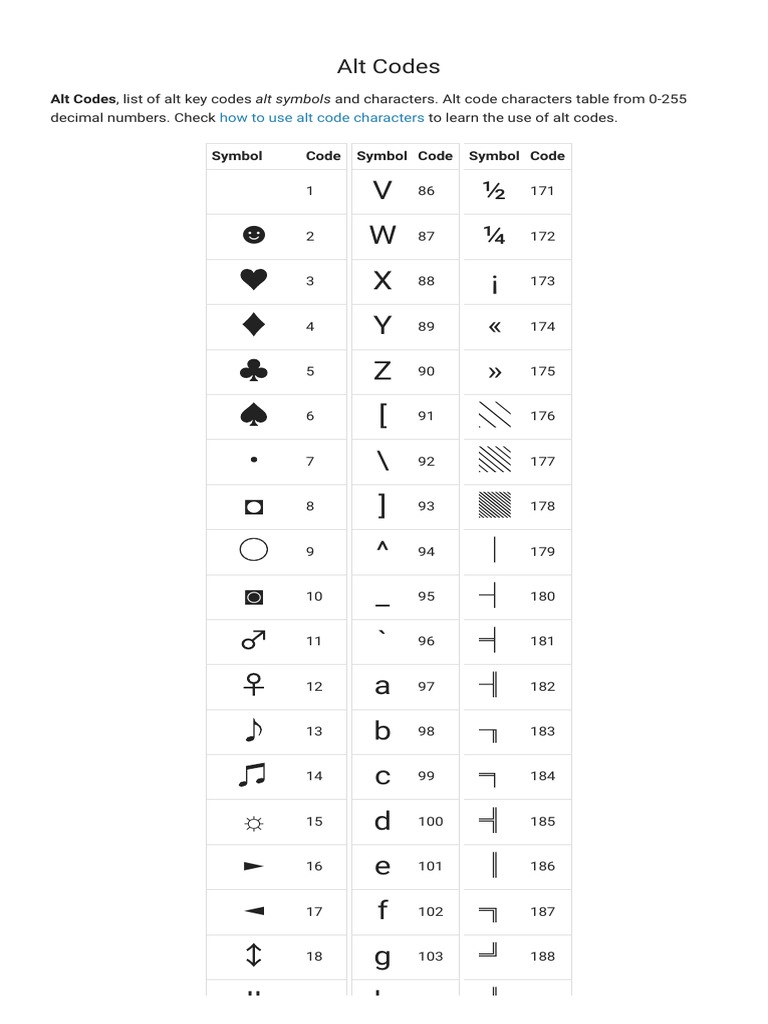 Free Printable Alt Codes - View the list of nfpa's codes and standards. Altcodeunicode.com alt codes reference chart press and hold the alt key, then type the numbers on the numeric keypad. List of state abbreviations for all the us states, us territories and the united states military. Alt codes, alt code, windows alt codes, complete list of alt codes created date: Alt codes reference chart the numbers on the numeric keypad. 258 rows this is the complete reference list of the original microsoft windows alt codes for special characters, signs, and symbols, which are based on the ascii character encoding. Alt codes, the all alt codes list for special characters and special symbols. File includes all the alt codes on this. Download our free printable windows alt codes pdf reference chart. You will need adobe's acrobat reader to open this file. View the list of nfpa's codes and standards. File includes all the alt codes on this. Click on the download button below. 258 rows this is the complete reference list of the original microsoft windows alt codes for special characters, signs, and symbols, which are based on the ascii character encoding. Alt codes, alt code, windows alt codes, complete list of alt codes created date: Altcodeunicode.com alt codes reference chart press and hold the alt key, then type the numbers on the numeric keypad. Alt codes reference chart the numbers on the numeric keypad. Complete list of windows alt codes keywords: Alt codes reference for you daily life Alt codes reference sheet author: Alt codes, alt code, windows alt codes, complete list of alt codes created date:. Alt codes reference sheet author: Printable list of alt codes to put near your pc Complete list of windows alt codes keywords: File includes all the alt codes on this. Alt codes, alt code, windows alt codes, complete list of alt codes created date: According to the us systems and tradition, all the states or territories are represented by abbreviations and codes for different purposes, including data processing and. Complete list of windows alt codes keywords: Search for the code/standard # and select the read more link. Alt codes, the. Complete list of windows alt codes keywords: Download our free printable windows alt codes pdf reference chart. Printable list of alt codes to put near your pc 258 rows this is the complete reference list of the original microsoft windows alt codes for special characters, signs, and symbols, which are based on the ascii character encoding. Alt codes reference for. 258 rows this is the complete reference list of the original microsoft windows alt codes for special characters, signs, and symbols, which are based on the ascii character encoding. Alt codes reference chart the numbers on the numeric keypad. Printable list of alt codes to put near your pc Click on the download button below. Alt codes, alt code, windows. Printable list of alt codes to put near your pc Alt codes, the all alt codes list for special characters and special symbols. Download our free printable windows alt codes pdf reference chart. File includes all the alt codes on this. Click on the download button below. Printable list of alt codes to put near your pc Download our free printable windows alt codes pdf reference chart. Learn how to use alt key codes. Search for the code/standard # and select the read more link. View the list of nfpa's codes and standards. File includes all the alt codes on this. Search for the code/standard # and select the read more link. View the list of nfpa's codes and standards. Complete list of windows alt codes keywords: You will need adobe's acrobat reader to open this file. Alt codes, alt code, windows alt codes, complete list of alt codes created date: Search for the code/standard # and select the read more link. File includes all the alt codes on this. Learn how to use alt key codes. Alt codes reference chart the numbers on the numeric keypad. Alt codes, the all alt codes list for special characters and special symbols. According to the us systems and tradition, all the states or territories are represented by abbreviations and codes for different purposes, including data processing and. View the list of nfpa's codes and standards. Click on the download button below. List of state abbreviations for all the us. You will need adobe's acrobat reader to open this file. Alt codes, alt code, windows alt codes, complete list of alt codes created date: Alt codes reference chart the numbers on the numeric keypad. Alt codes reference sheet author: According to the us systems and tradition, all the states or territories are represented by abbreviations and codes for different purposes,. Alt codes, alt code, windows alt codes, complete list of alt codes created date: Alt codes reference chart the numbers on the numeric keypad. Complete list of windows alt codes keywords: Learn how to use alt key codes. Printable list of alt codes to put near your pc Search for the code/standard # and select the read more link. Click on the download button below. Download our free printable windows alt codes pdf reference chart. Alt codes, the all alt codes list for special characters and special symbols. According to the us systems and tradition, all the states or territories are represented by abbreviations and codes for different purposes, including data processing and. Alt codes, alt code, windows alt codes, complete list of alt codes created date:. 258 rows this is the complete reference list of the original microsoft windows alt codes for special characters, signs, and symbols, which are based on the ascii character encoding. Alt codes reference sheet author: You will need adobe's acrobat reader to open this file. Altcodeunicode.com alt codes reference chart press and hold the alt key, then type the numbers on the numeric keypad.Alt Codes For Symbols